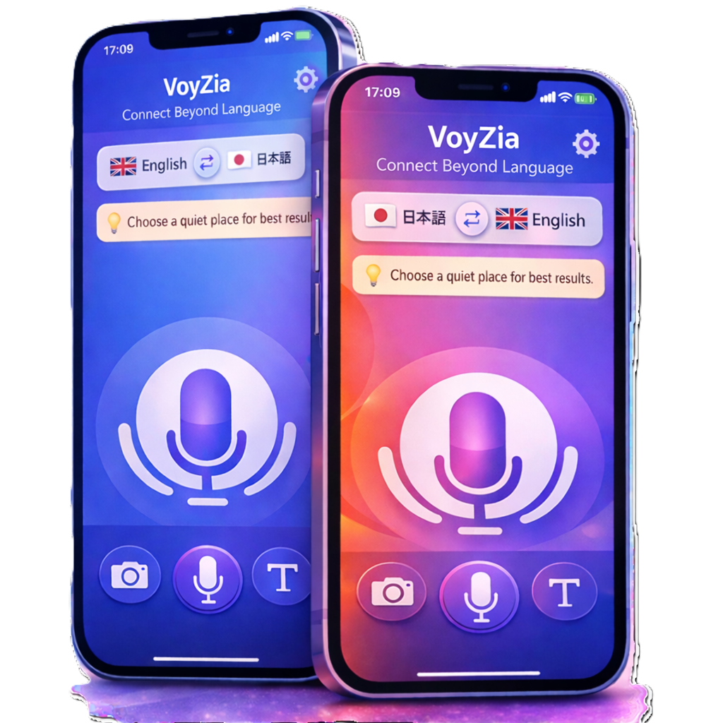 Two people, one phone. Each person types in their own language — VoyZia translates in real time so both sides understand each other instantly.